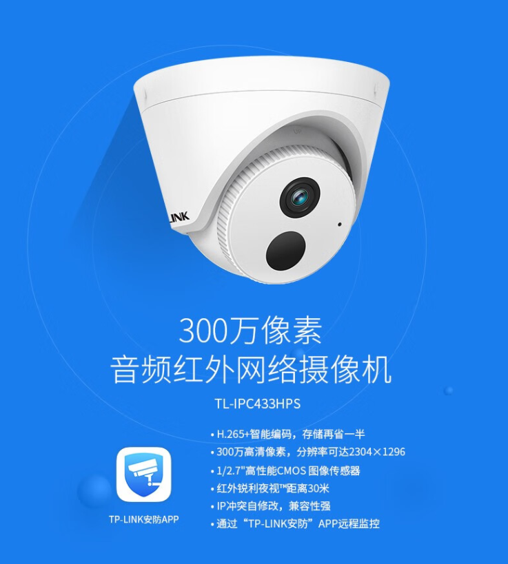 監(jiān)控攝像機(jī)普聯(lián)/TP-LINK300萬 DC供電智能網(wǎng)絡(luò)攝像頭高清夜視遠(yuǎn)程監(jiān)控TL-IPC433HS/臺